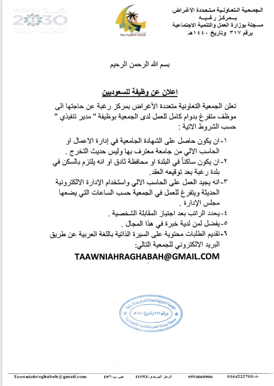 تعلن الجمعية التعاونية متعددة الأغراض برغبة عن توفر وظيفة مدير تنفيذي (سعودي) بدوام كامل وفق الشروط المرفقة.